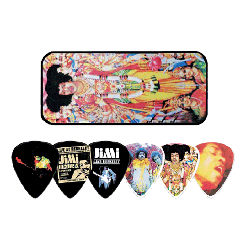 Largement reconnu par les critiques et par de nombreux fans, Jimi Hendrix est considéré par beaucoup comme l'un des guitaristes électriques qui a eu le plus d'influence dans l'histoire du rock. Afin de commémorer les œuvres phares de l'artiste, Dunlop a créé cette collection de médiators Celluloid à l'effigie de ses albums.