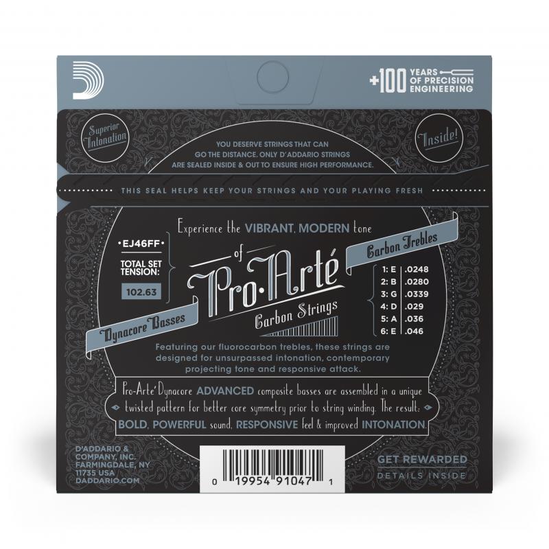 Les cordes Pro Arté Carbon offrent une intonation supérieure et de belles sonorités, pleines de brillance et de projection.Bénéficiant de nos cordes graves Dynacore en composite et de nos aiguës en fluorocarbone, la gamme Pro Arté Carbon procure une excellente réponse de jeu et un caractère tonal exceptionnel.Ce jeu est constitué de cordes avec extrémités à nouer, fabriquées en nylon monofilament avec un filet en cuivre plaqué argent.Chaque jeu de cordes D’Addario Pro Arté Carbon pour guitare classique est fourni dans une pochette VCI refermable et recyclable, sur laquelle est inscrit un code que vous pouvez enregistrer pour gagner des points Players Circle.Tension Forte