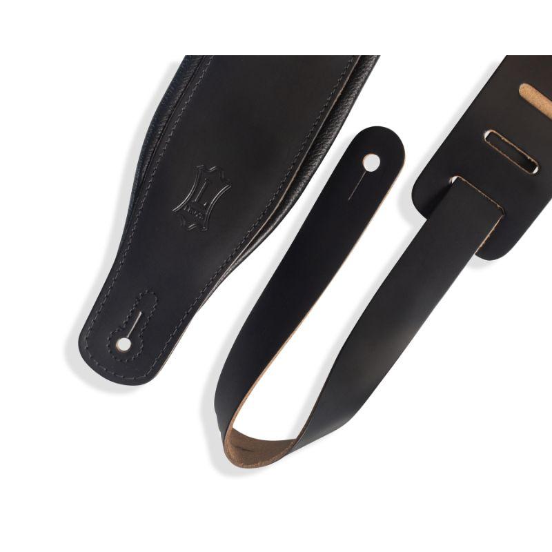 • Sangle de guitare Levy's 3″ en cuir pleine fleur noir avec rembourrage en mousse enveloppé de cuir noir.