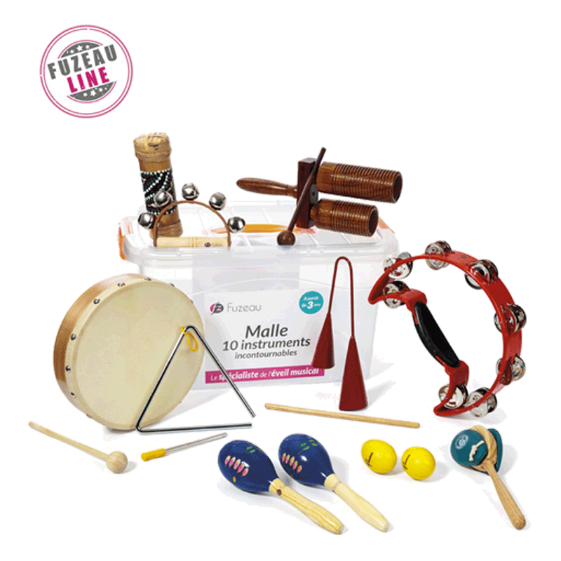 Cette malle regroupant 10 instruments incontournables est idéale pour apprendre à travailler le rythme et expliquer les différents phénomènes de production sonore en fonction de chaque type d'instrument.