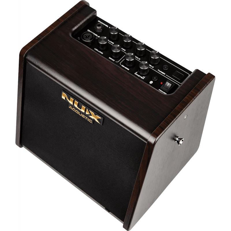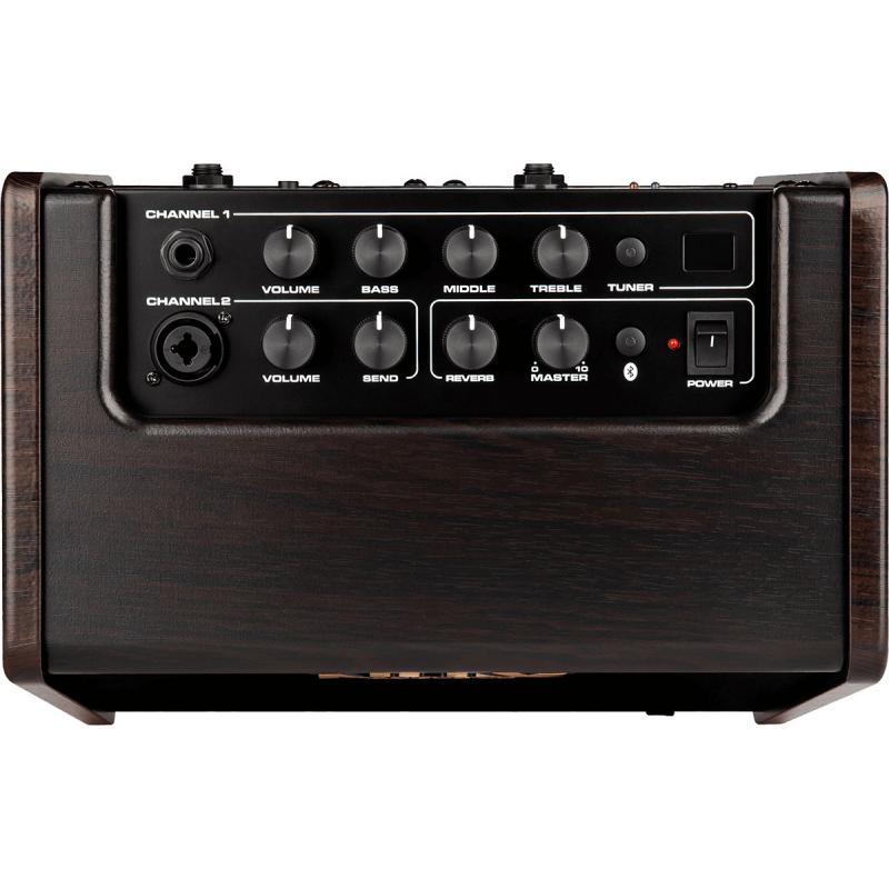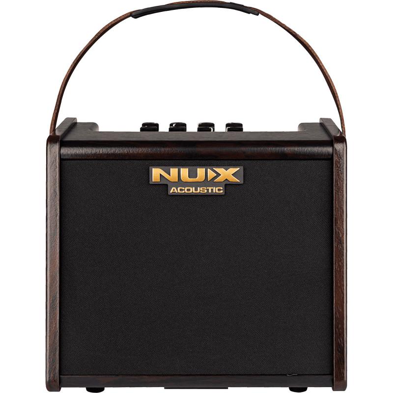 Le Nux AC-25 est un ampli sur batterie proposant deux canaux, optimisés pour la guitare électro-acoustique et pour un micro dynamique pour voix, parfait pour chanter en s’accompagnant avec son instrument.