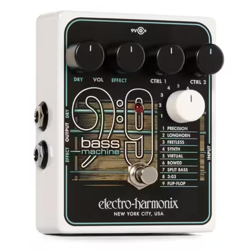 La BASS9 polyphonique transforme une guitare en neuf basses différentes sans avoir besoin de micros spéciaux, de MIDI ou de modifications de l'instrument. Elle s'appuie sur la même technologie que celle qui équipe toutes les pédales de la série EHX 9, comme la MEL9® Tape Replay Machine récompensée par de nombreux prix, mais dispose d'un nouvel algorithme optimisé pour transposer une à deux octaves vers le bas avec une dynamique et un suivi améliorés.