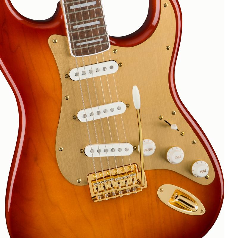 Ce modèle commémoratif présente également des éléments destinés à faciliter le jeu, tel que des mécaniques de style vintage et un chevalet à six pontets, avec son vibrato synchronisé, le tout lui conférant un style et des performances authentiques ; sans oublier les micros Fender-Designed à simples bobinages et aimants Alnico 5 qui vous feront retrouver le son familier de la Strat.