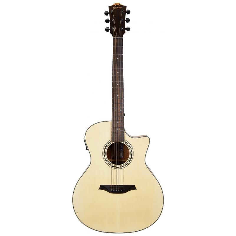 La guitare BROMO BAA2CE adopte un gabarit Auditorium Cutaway, une table en Epicéa, un dos, des éclisses et un manche en Acajou ainsi qu'une touche en Ebène, le tout magnifié par une finition satinée. La présence d'un préampli 3-Band EQ Bromo BZP1 vous permet d'électrifier votre guitare.