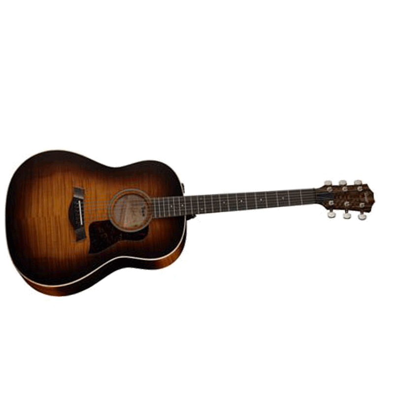 Guitare acoustique électrifiée Taylor AD27e Flametop de la série American Dream. Style de carrosserie Grand Pacific avec épaules arrondies. Table, éclisses et dos en érable massif flammé. Manche en érable et touche en eucalyptus. Capodastre en graphite