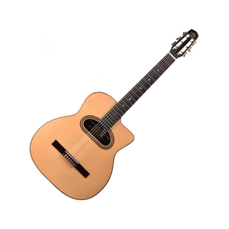 Dans la lignée des mythiques Selmer-Maccaferri (Maccaferri Concert Classical), la ALTAMIRA Gypsy Jazz M01 Macca CC est une guitare Jazz Manouche Grande Bouche élaborée à partir d'essences triées sur le volet : table massive Epicéa européen, dos et éclisses Palissandre indien laminé, manche Acajou et touche Ebène.