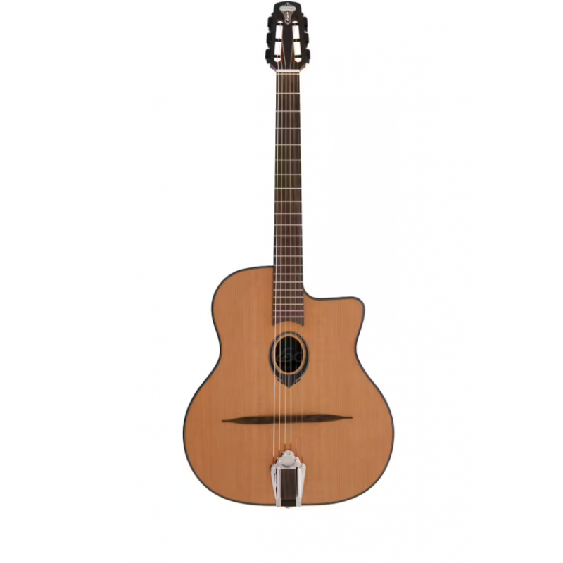 Le coeur sonore de la SL100 vient de sa table massive en cèdre rouge. Le cèdre est apprécié pour sa réponse rapide et sa sensation de fluidité sous la main droite : il met facilement le son en mouvement et offre des médiums présents, idéals pour faire ressortir les voicings d'accords et les lignes mélodiques. Associé au dos et aux éclisses en acajou, on obtient un registre médium chaleureux, avec une rondeur agréable, tout en gardant l'attaque nécessaire au jeu manouche.