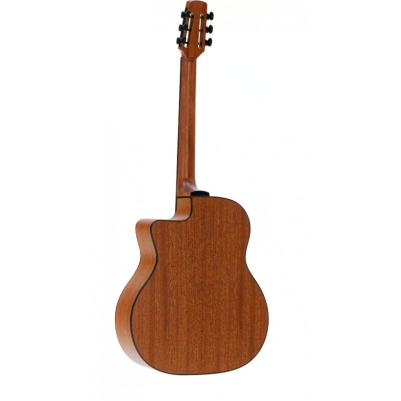 Le format petite bouche est recherché pour son articulation et sa projection " concentrée " : les notes se détachent clairement, ce qui aide autant en jeu solo qu'en pompe rapide. La présence d'un cordier métallique (caractéristique de ce type de guitare) et d'un chevalet en palissandre favorise une transmission directe des vibrations, donnant une attaque plus marquée et une sensation de précision rythmique. Les sillets en os contribuent à la netteté du départ de note, au sustain utile sur les phrases et à une intonation plus stable. L'ensemble est complété par une finition satinée qui laisse l'instrument respirer et donne une sensation naturelle, très agréable au toucher.
