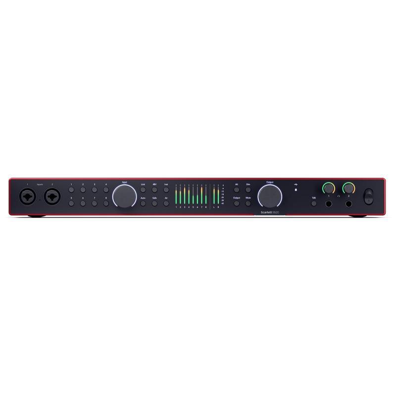 La Scarlett 18i20, référence des interfaces USB pour petits studios, utilise les convertisseurs RedNet. Avec 8 préamplis de 4e génération et 69 dB de gain, elle capture les sons dynamiques. Auto Gain et Clip Safe optimisent les niveaux, tandis que ses nombreuses E/S et Focusrite Control 2 facilitent l'intégration.