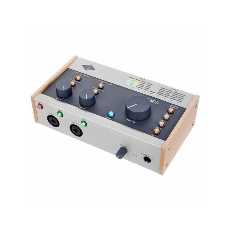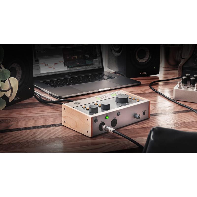 Connexions : 2x entrées combo micro/instrument/ligne XLR/jack 6,3 mm, 2x entrées ligne jack 6,3 mm, 4x sorties ligne jack 6,3 mm, sortie casque stéréo jack 6,3 mm, 1x entrée et sortie MIDI, entrée 5V CC pour alimentation, connecteur USB-C
