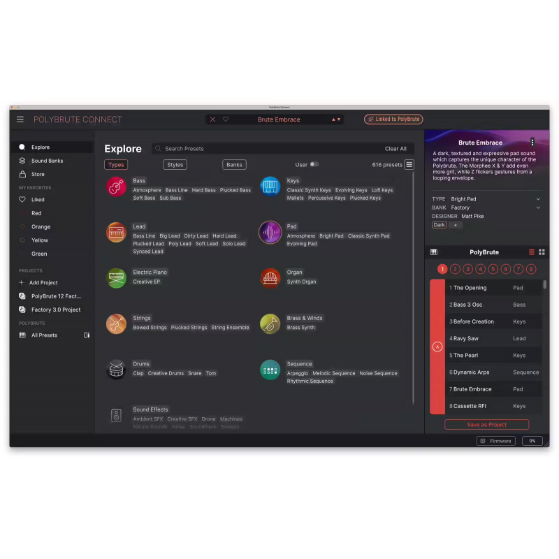 La bibliothèque du PolyBrute comprend des centaines de présets comprenant du morphing bitimbral et utilisant les innovations de cette nouvelle machine – 480 pour être précis.
