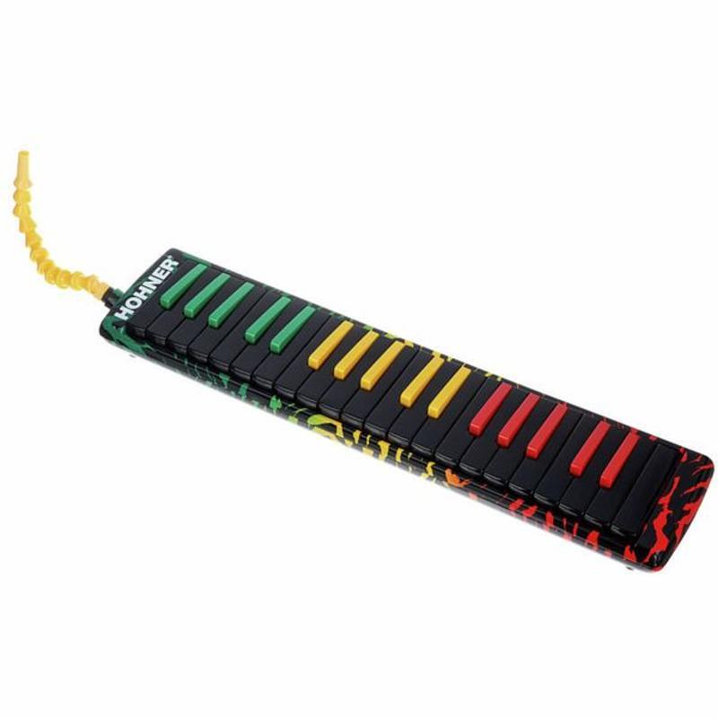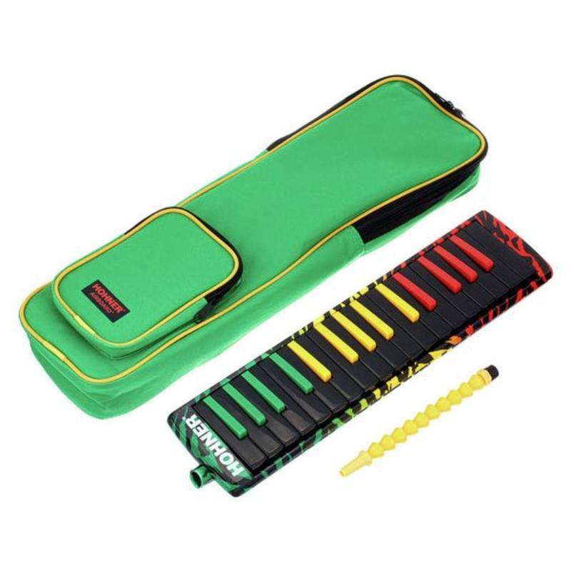 Un mélodica vibrant aux couleurs rasta, avec 32 touches. Parfait pour les musiciens nomades, il est livré avec un embout ergonomique et une housse. Style unique et sonorité expressive garantis !