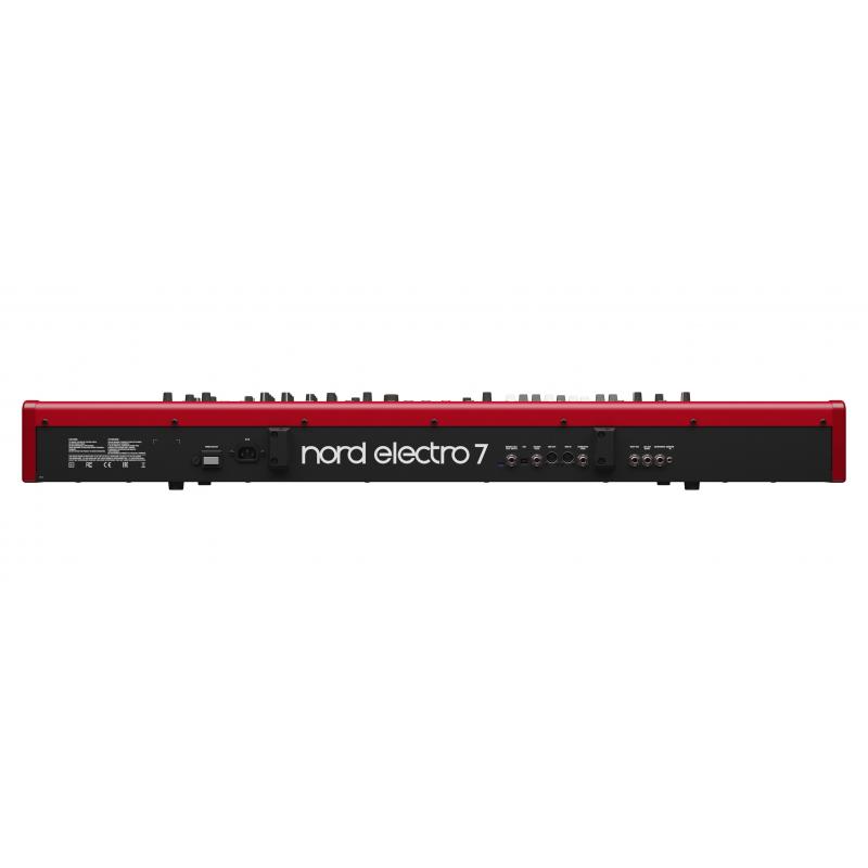 La section Piano s'appuie sur des échantillons premium issus de la " Nord Piano Library " avec résonance sympathique, filtres dynamiques et compression dynamique pour une présence immédiate dans le mix. Côté synthèse, lecture d'échantillons, formes d'ondes analogiques et FM se combinent pour couvrir des textures modernes ou rétro. La section Orgue embarque la modélisation du Nord Organ 3 pour des roues phoniques, transistors et un orgue liturgique d'un réalisme saisissant. Conçu pour la scène, l'Electro 7 ne comporte pas de haut-parleurs intégrés.