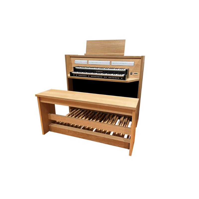 L'orgue de salon Johannus Opus 260 propose un clavier double et un pédalier droit 30 notes et deux pédales d'expression.
